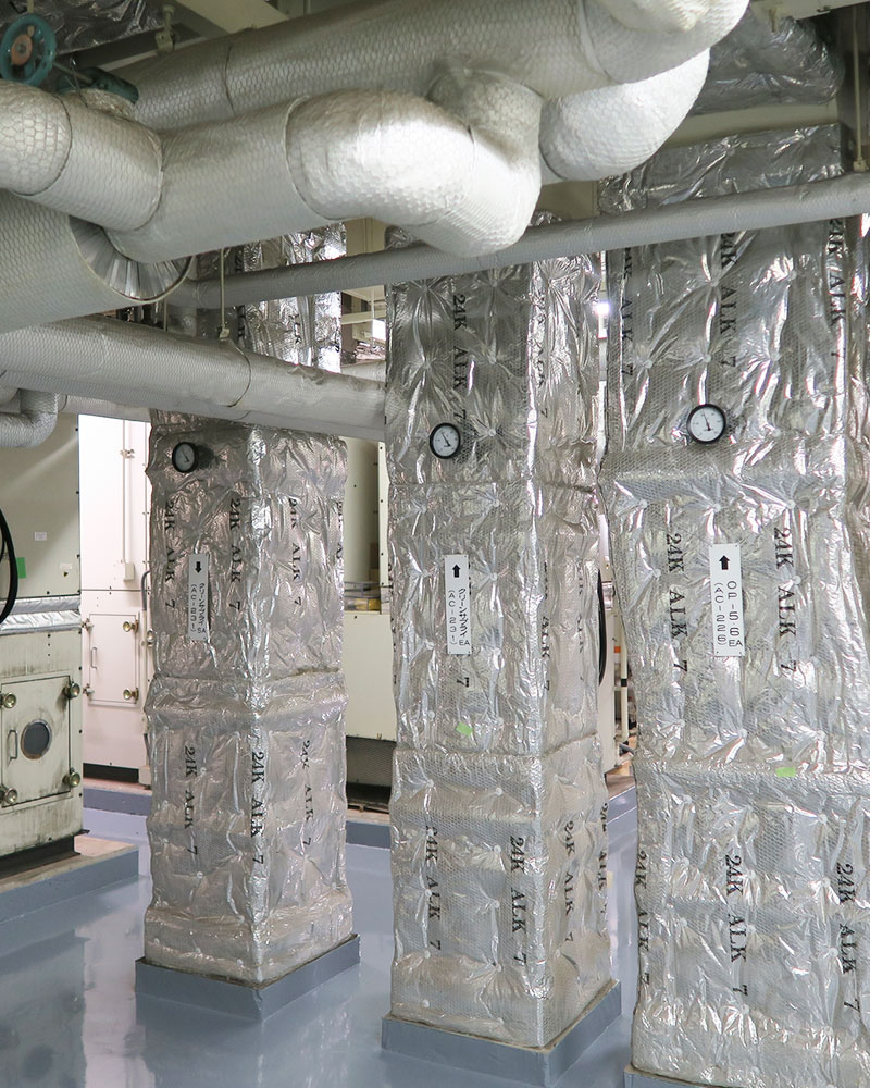 ダクトなど暖かい空気や冷たい空気の通り道を保温する工事です。空調設備に欠かせない加工を行います。